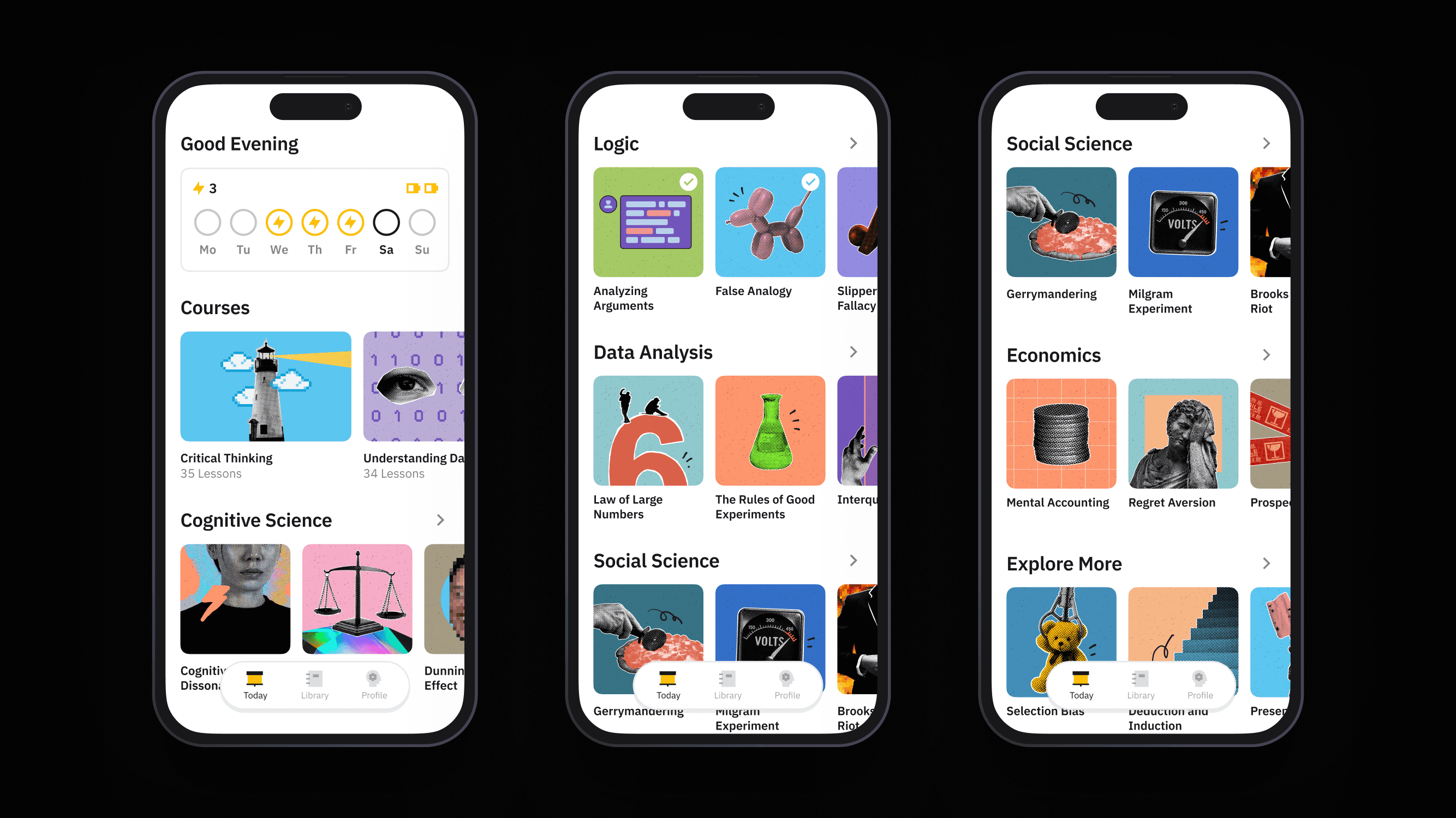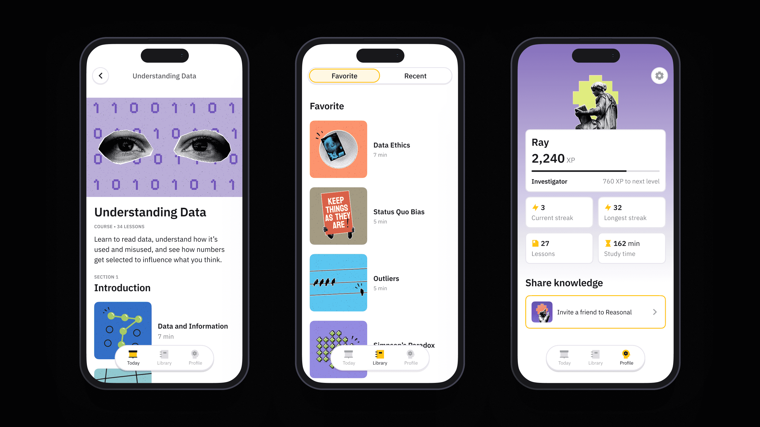 Reasonal is a mobile app that teaches critical thinking in a fun and interactive way. The task was to create "Duolingo for critical thinking skills".